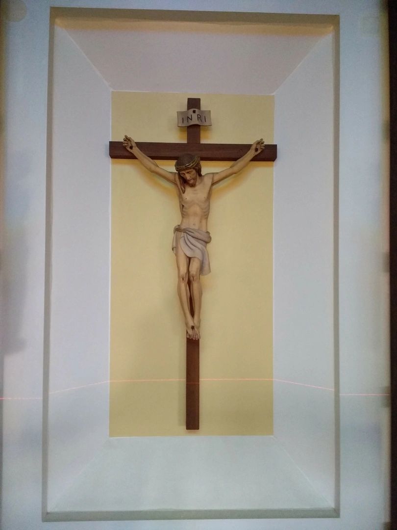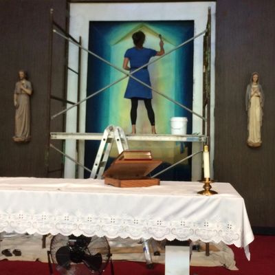 In the second (before) picture, you can see that Jesus is lost in a lack of reverence. This is a giant oil painting. The theme was the psalm. My intention was to create a feeling of depth around Jesus, and give Jesus due reverence in giving Him more focus on the eyes thus the hearts and minds of all those that actually see Him, as opposed to just noticing Him before his surrounding was painted. The eyes cannot help but see Him. He is out of the depths and the brilliance around Him is like the brilliance of the resurrection, heaven and He who is light and love. My hope is that more will be drawn to Him physically and spiritually in experiencing Jesus in this way.